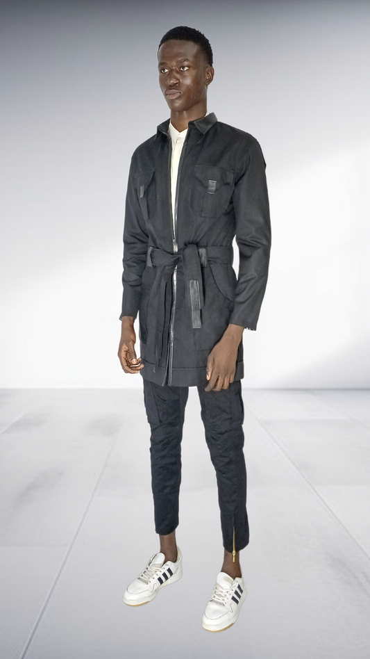 Naked Ape Oil Skin Jacket, Linen Mandarin Shirt & Cargo Pants Set - Black