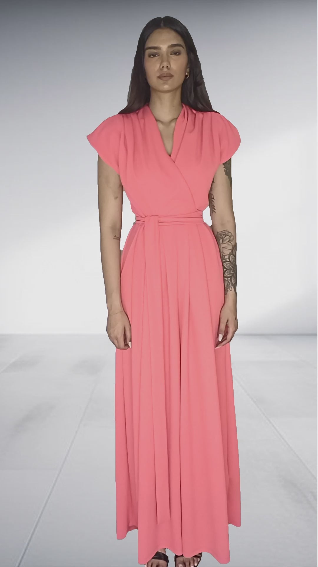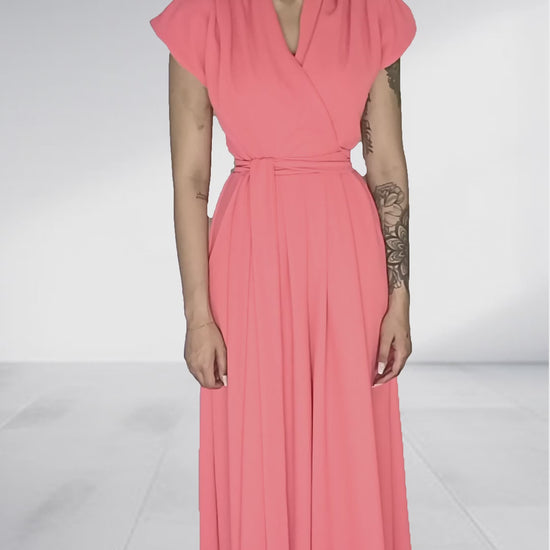 Embrace effortless elegance with this stunning coral pink wrap maxi dress that combines sophisticated styling with comfortable wear. The vibrant coral hue brings warmth and radiance to any occasion.