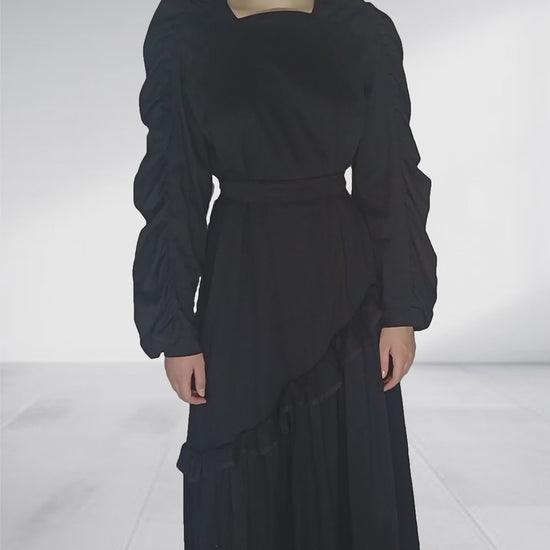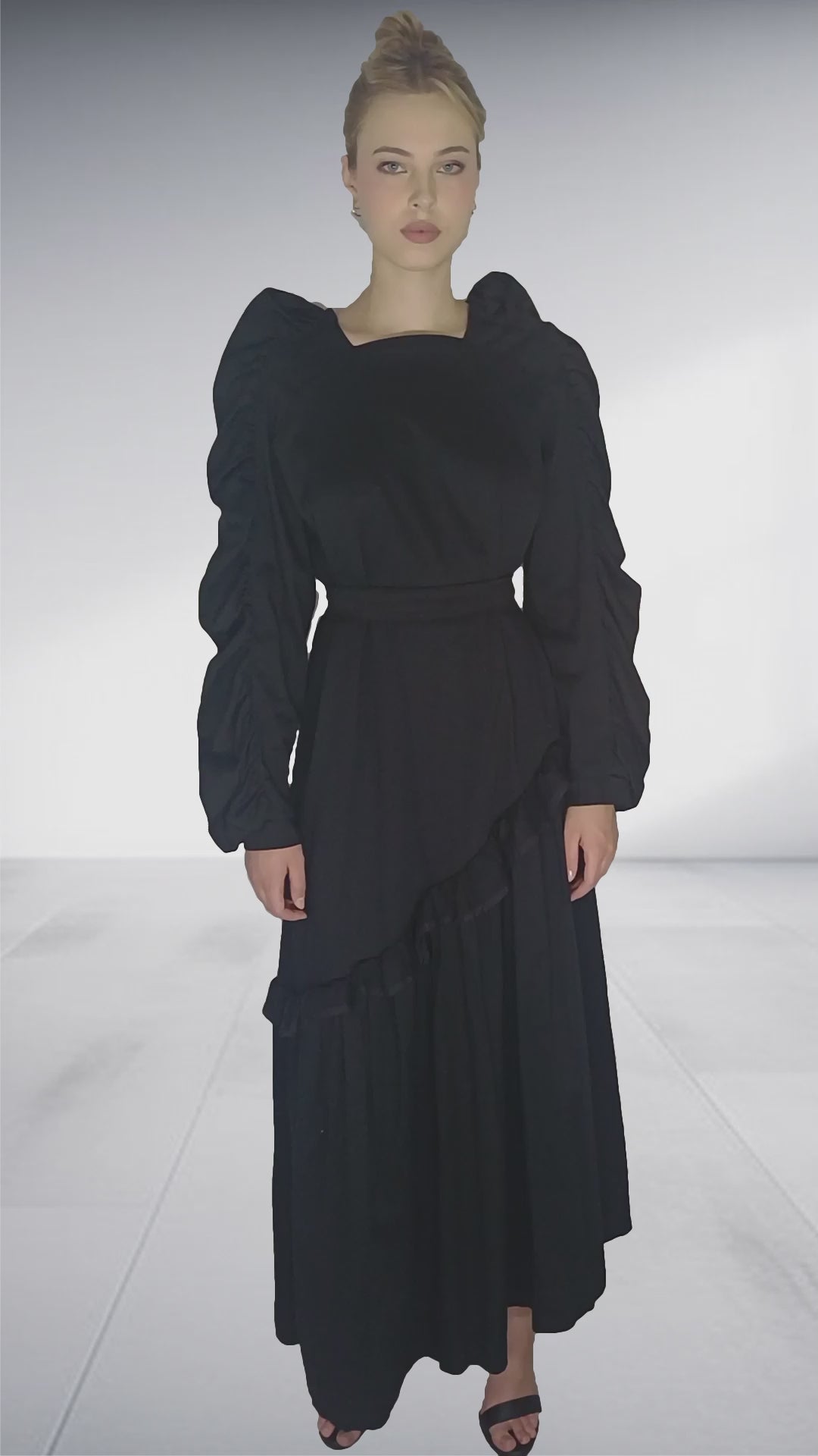 A stunning gender-inclusive full-length dress featuring gathered bubble sleeves and an asymmetrical curved frill detail. Crafted from premium cotton poplin stretch for comfort and style.