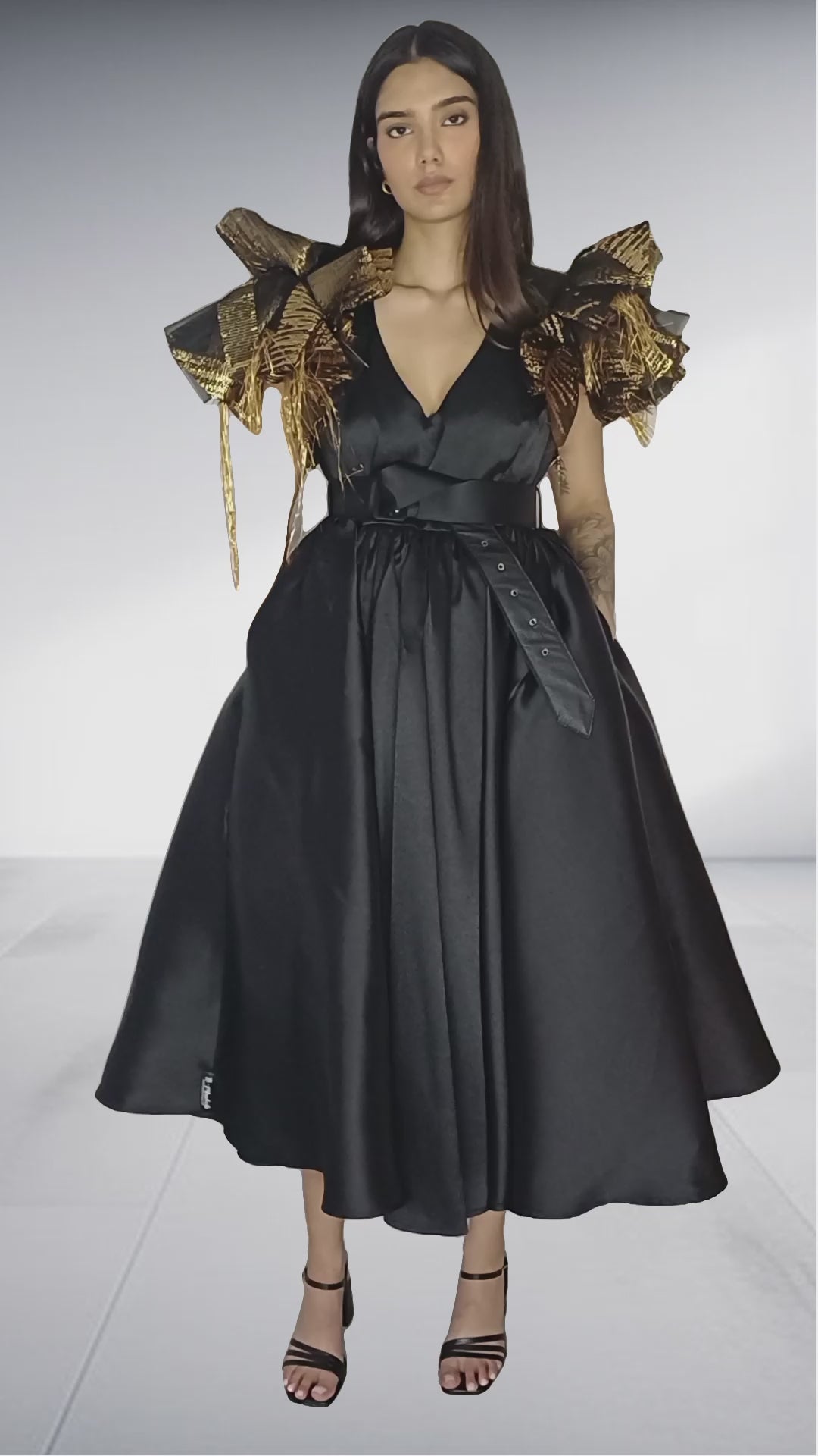 Elegant and timeless, the Lehlokwe Dress makes a striking statement in classic black with luxurious gold detailing. The design features flared sleeves adorned with gold tassel-like strips that add beautiful texture and movement. Finished with a flattering V-neckline and a graceful tea-length cut, Lehlokwe is the embodiment of sophistication and effortless class.