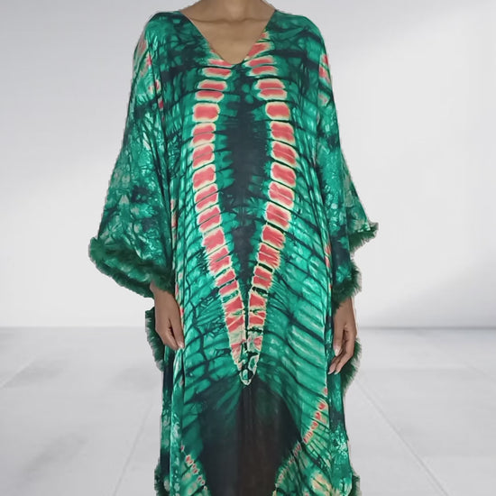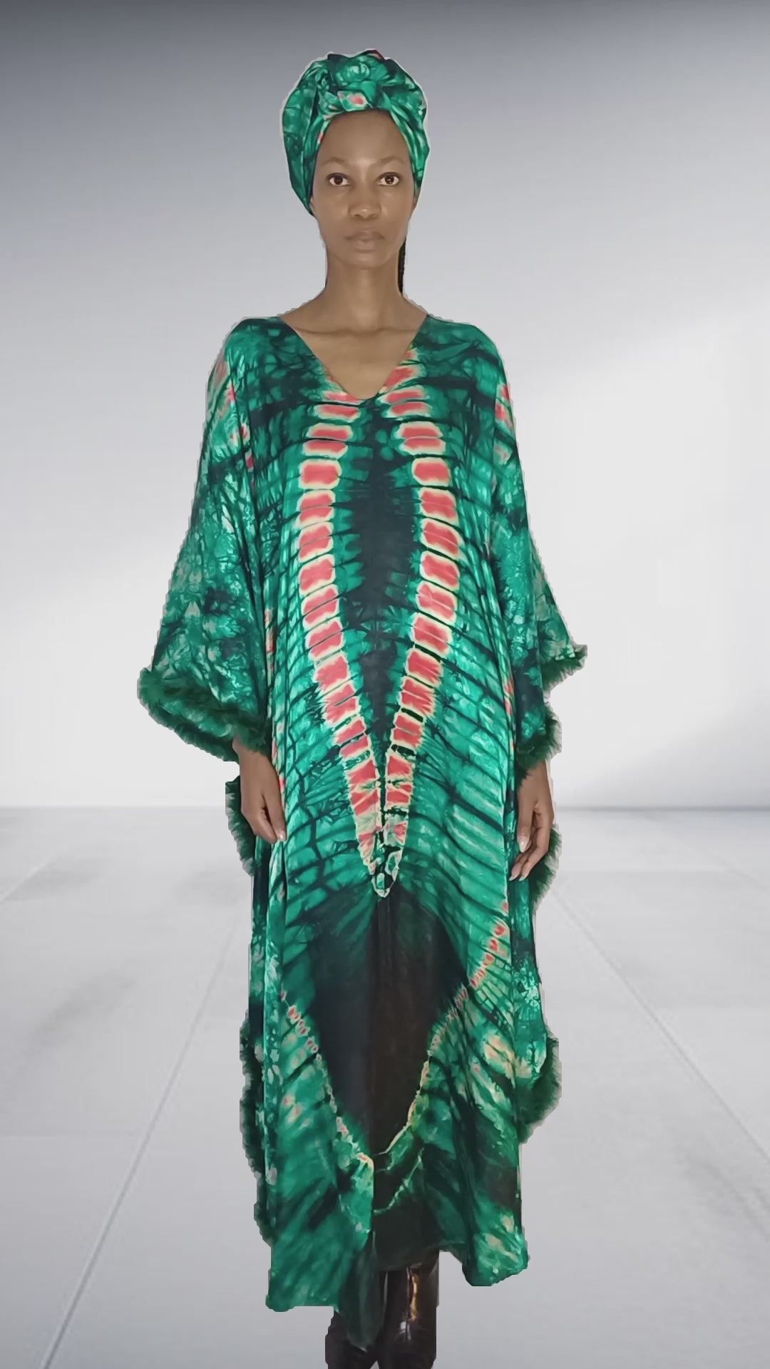 Crafted from rich Adire silk, this kaftan redefines elegance with soft fur detailing along the edges for a sophisticated finish. Designed with a flattering V-neckline, it offers both comfort and graceful movement. A true statement of refined African luxury.