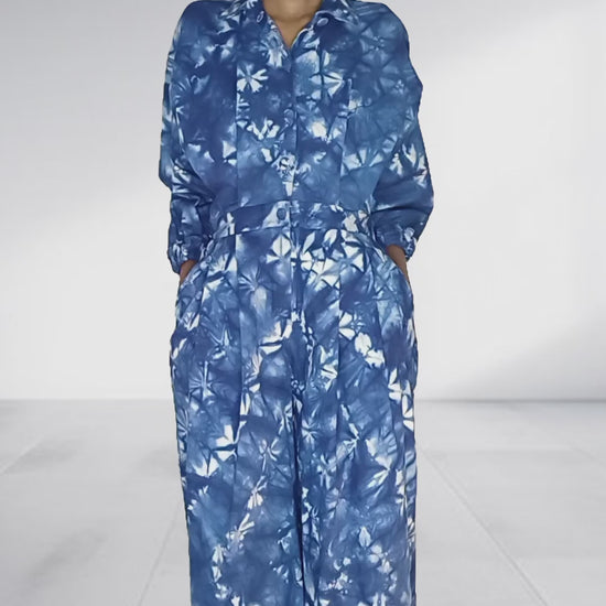 This oversized jumpsuit, crafted from rich cotton-denim tie-dye fabric speaks to modern African expression. The button-up front and collar makes it contemporary, while the elasticated back waistband ensures an easy fit. Wide legs and functional pockets bring comfort, and the adjustable elastic sleeves let you style it your way.
